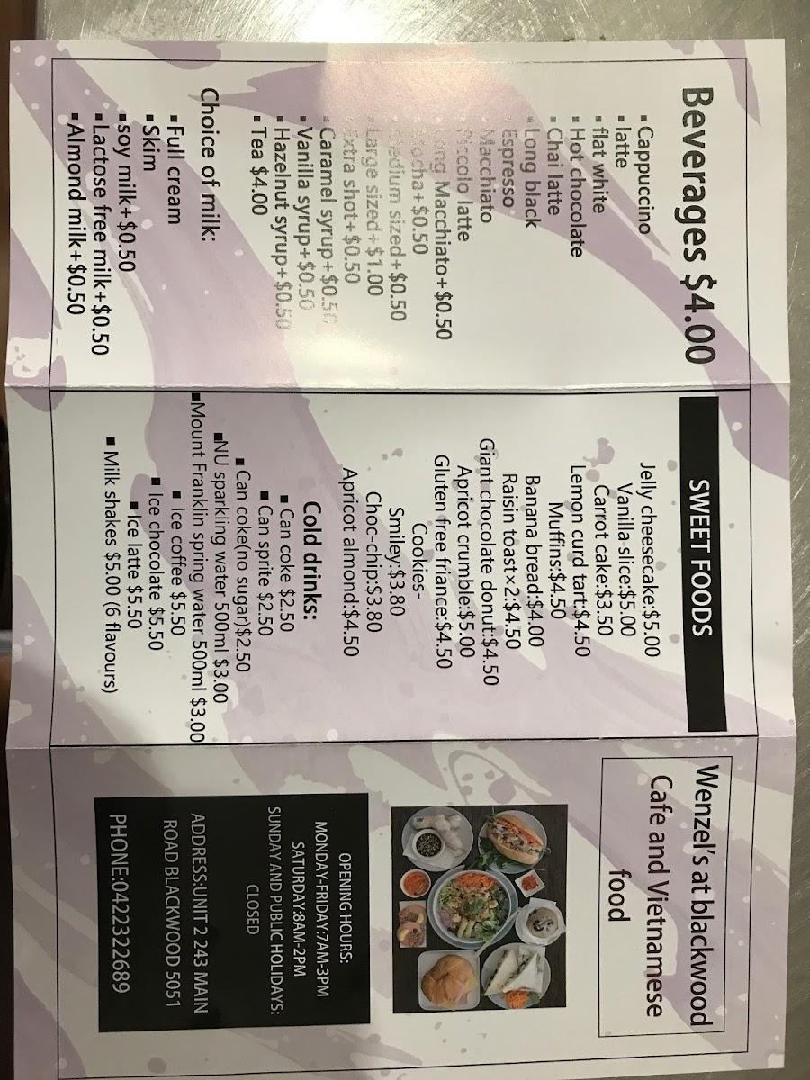 Coffee enthusiasts can savor hot or cold brews for A$3.90, which many customers rave about. Patrons like Merry Xu and Michael Raftos highlight the abundant, tasty ingredients, and the café’s genuine charm. Wenzel's at Blackwood promises good food, excellent service, and a welcoming vibe—an absolute must-visit!